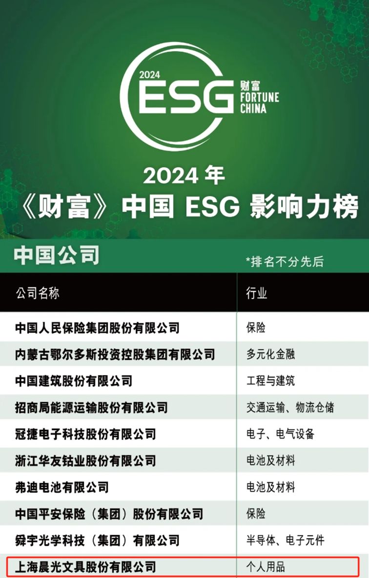 文具行业唯一!晨光荣登2024年《财富》中国ESG影响力榜