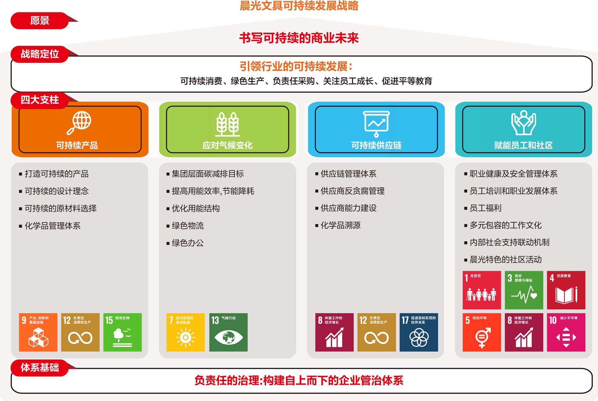 作为中国文具行业首个发布ESG报告的上市企业,晨光在“以消费者为中心”的价值观指引下,主动选择将企业商业战略进行可持续深化,做有温度的好文具,于2021年确立了首个可持续发展战略,以“书写可持续的商业未来”为可持续发展愿景,围绕可持续产品、应对气候变化、可持续供应链、赋能员工和社区四大战略支柱,积极推进可持续发展进程,并稳步建设负责任的公司治理,以自身探索赋能行业可持续、高质量发展,向世界展示中国品牌的责任与担当。