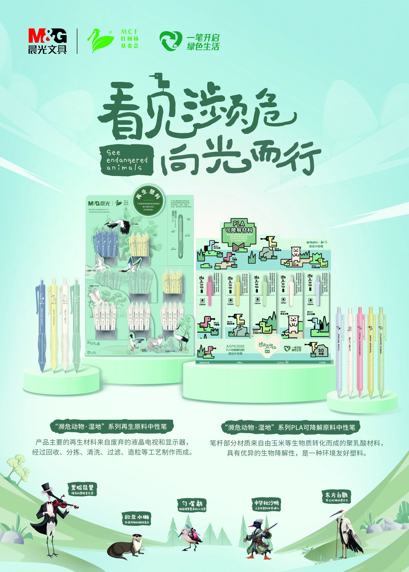今年年初,晨光携手红树林基金会推出“濒危动物·湿地”系列产品,采用PLA可降解材料和再生材料,减少塑料污染。还将食品级原材料运用在彩铅、马克笔、水彩笔、彩泥等多个小类产品的生产中,为低龄儿童提供更加安全放心的美术用品。