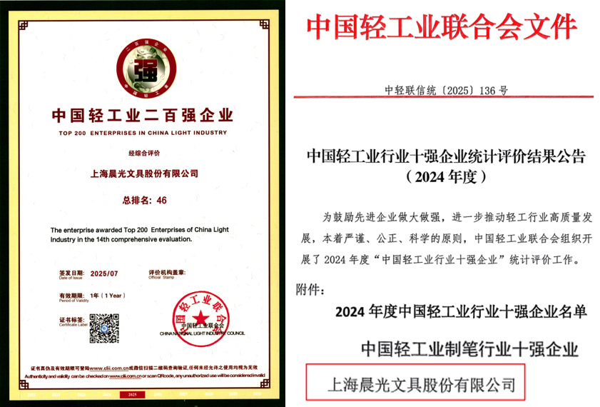 据悉,中国轻工业联合会本着严谨、公正、科学的原则,组织开展了本次2024年度“中国轻工业二百强企业”、“中国轻工业制笔行业十强企业”等多项名单的统计评价工作,对申报企业2024年度的营业收入、利润总额、营业收入利润率、税收占利税比重、研发投入及营业收入增速六项指标进行统计,按统一标准体系进行综合评价,具有很高的权威性和社会影响力。晨光与美的、格力、伊利、蒙牛等行业领军企业一起荣登“中国轻工业二百强企业”名单,共同构成轻工业现代化产业体系的先锋力量。