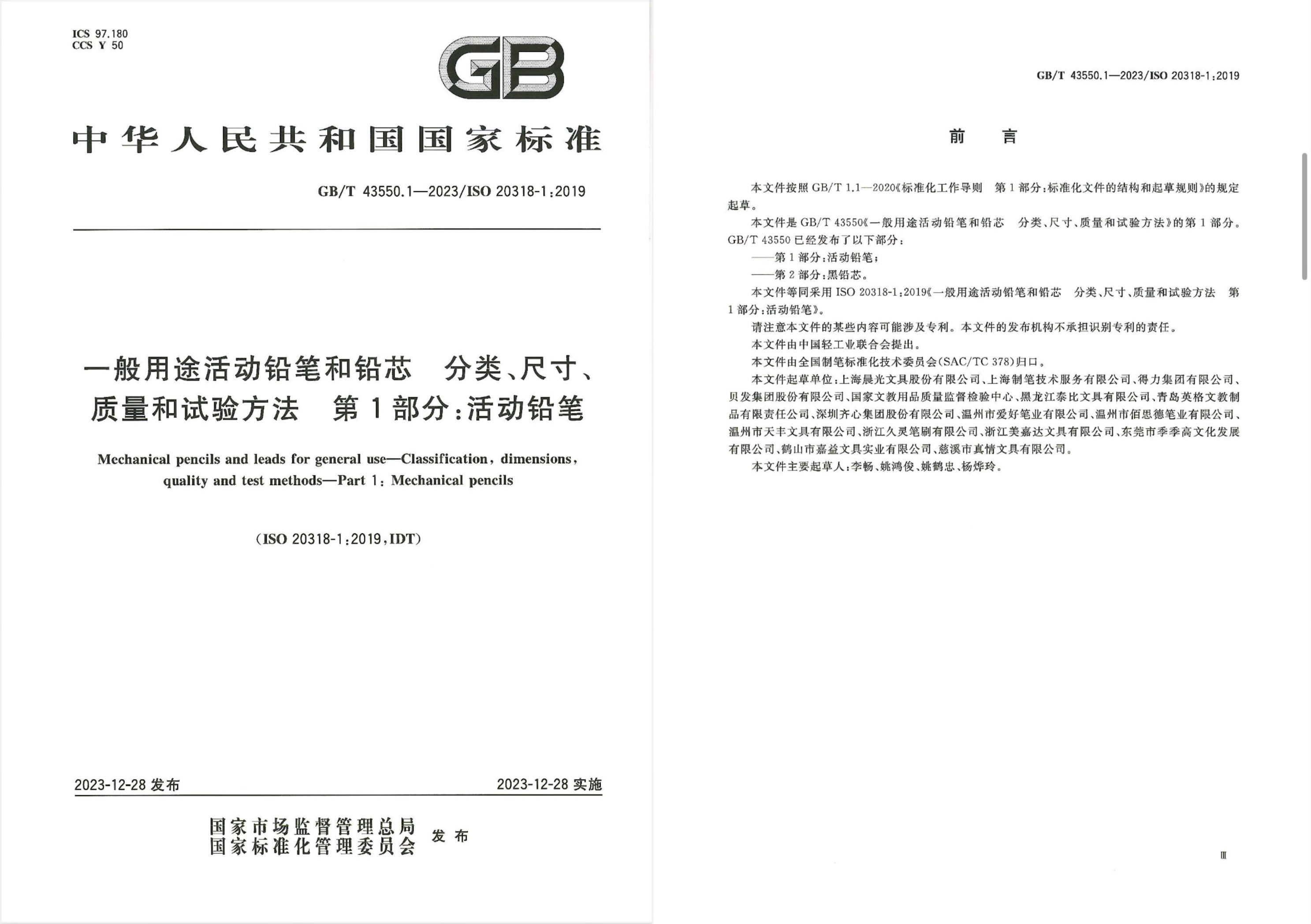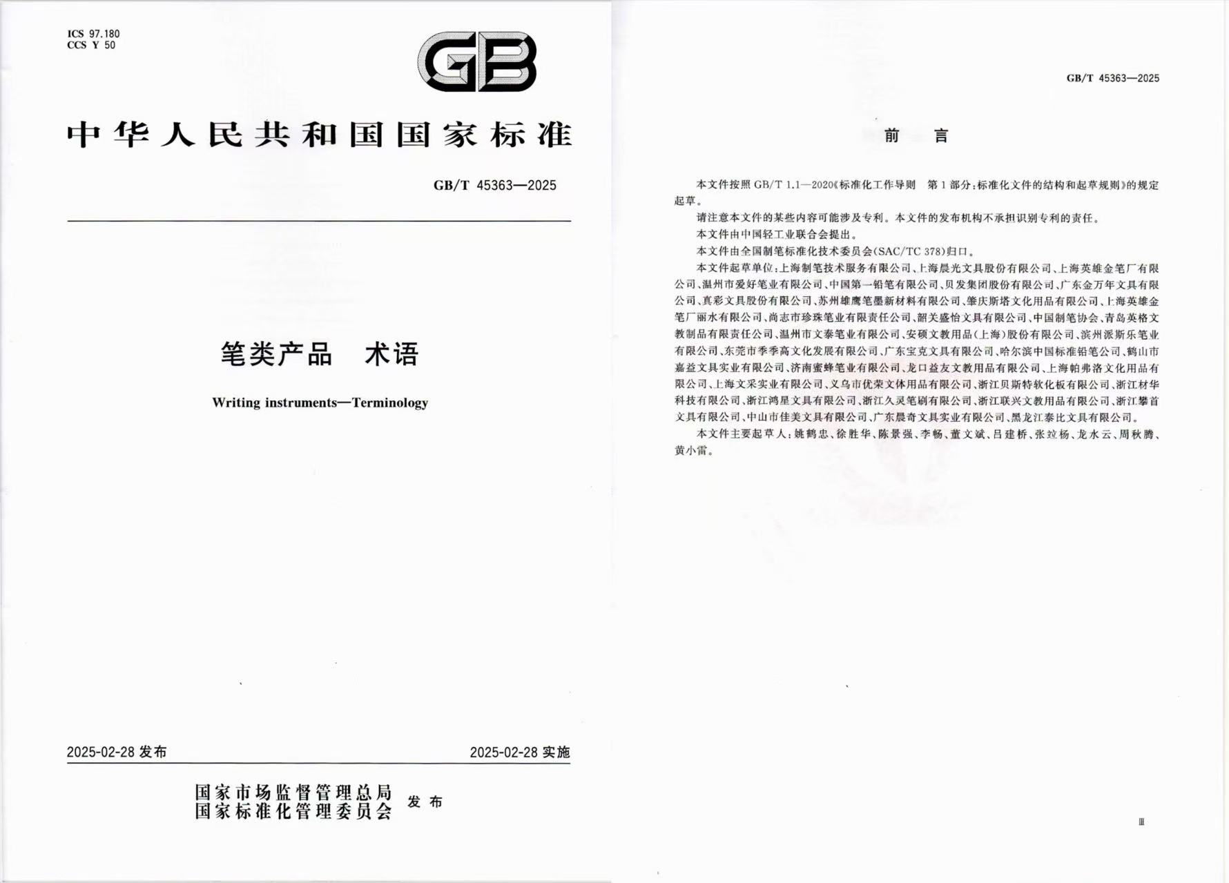 在标准制修订方面,晨光坚持以市场需求为导向、以技术创新为支撑,深度参与多项关键标准的制定与优化。晨光作为主要起草单位,全程参与国家标准《消费品质量分级导则笔类产品》的编制,填补了笔类产品质量分级领域的空白。此外,面对中性墨水圆珠笔速干化的发展趋势,晨光牵头开展市场调研,收集国内外知名品牌畅销产品数据,推动修订中性墨水标准,持续引领行业标准的权威高度。