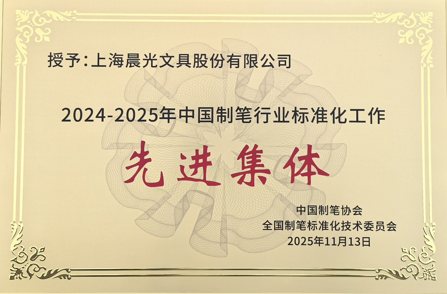 发布日期:2025-11-18近日,2025年全国制笔标准化技术委员会年会暨中国制笔行业标准化工作会议在浙江湖州召开。会上,上海晨光文具股份有限公司凭借在标准化建设方面的持续深耕与突出贡献,被授予 “2024-2025年度中国制笔行业标准化工作先进集体” 称号,彰显了行业对其标准化工作的权威认可,也体现了晨光作为领军企业在推动产业规范发展中的示范作用。