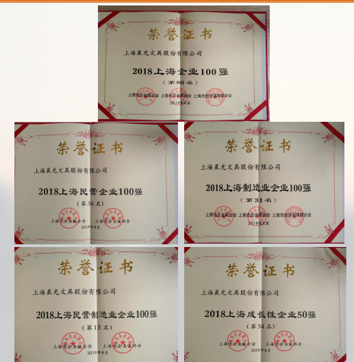 (晨光文具2018年上海企业100强榜单荣誉证书)